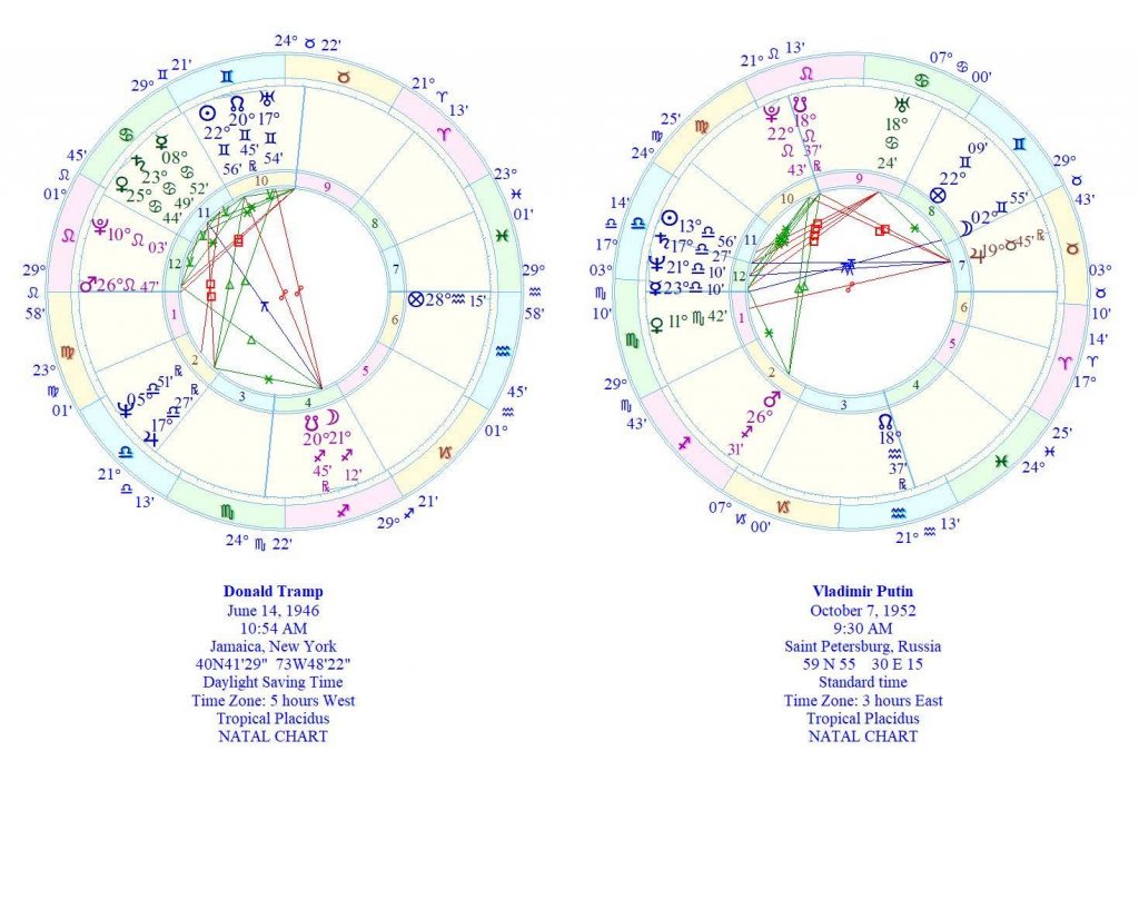 Tramp i Putin su rivali i neprijatelji iz prošlih života, jer je Putinov Mars (planeta rata, rivalstva i neprijateljstva) u konjunkciji i opoziciji sa čvorovima Donalda Trampa. Međutim, i Mars Donalda Trampa nalazi se u konjunkciji sa Plutonom u Lavu Vladimira Putina.