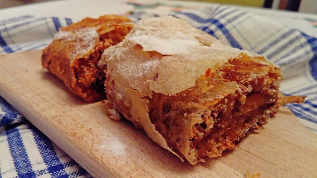 Potom, stavite treću koru na koju ćete staviti rendanu bundevu, pomešanu sa kristal šećerom, grizom i cimetom. Krajeve kore uvijte na unutra, da se nadev ne bi rasipao, i potom urolajte kore u rolat.