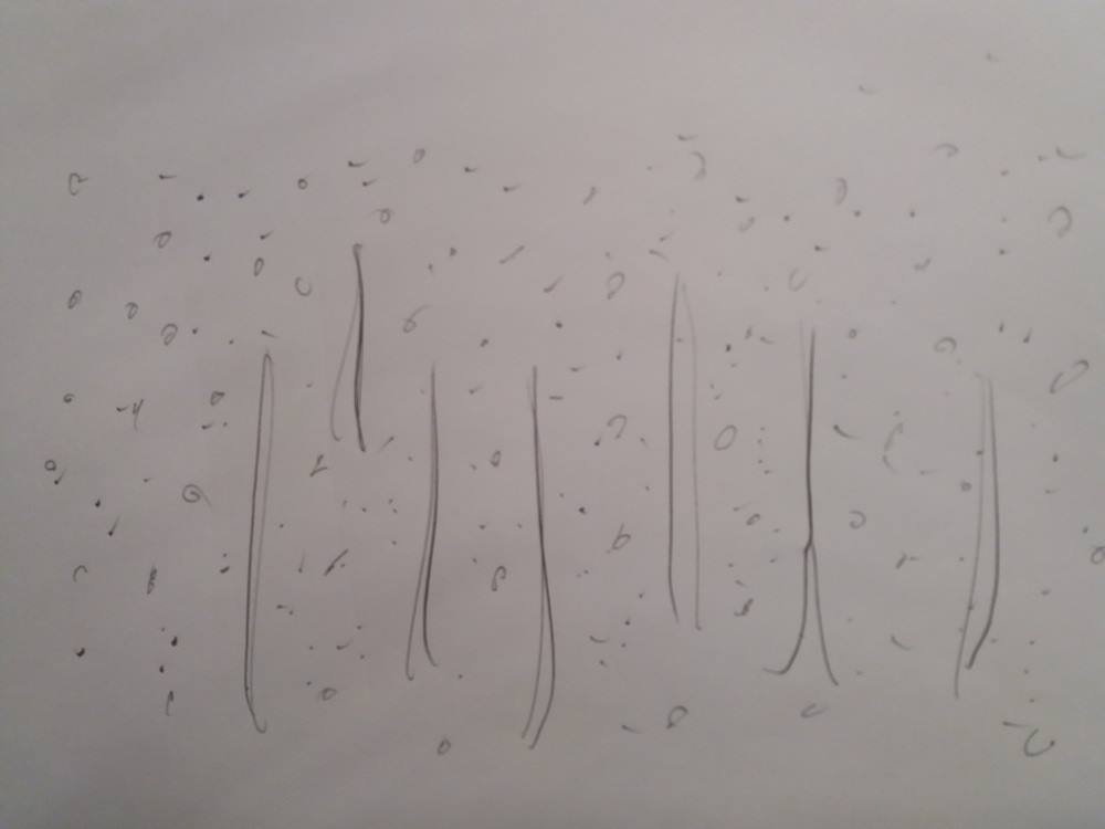 I nacrta nekoliko uspravnih linija. Objašnjava mi da su to njegova loša iskustva od ranije. Zatim, nacrta gomilu tačaka okolo.