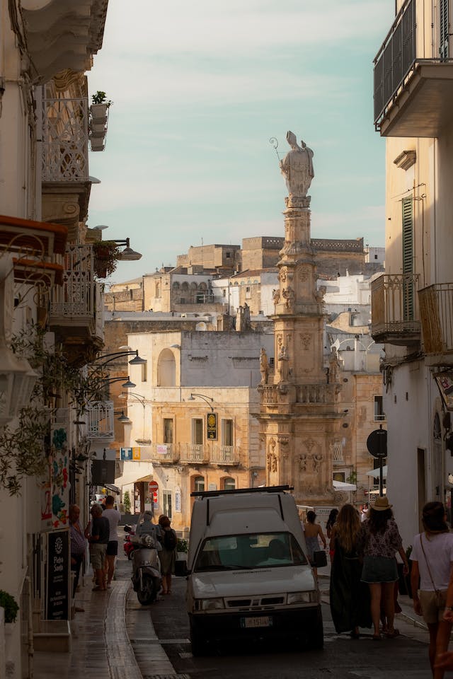 Na vrhu se nalaze katedrala u Ostuniju iz petnaestog veka, sa velikim prozorom, biskupska palata i stara Bogoslovija. Ne propustite da se fotografišete ispred instagramiranih Porta del Salento.