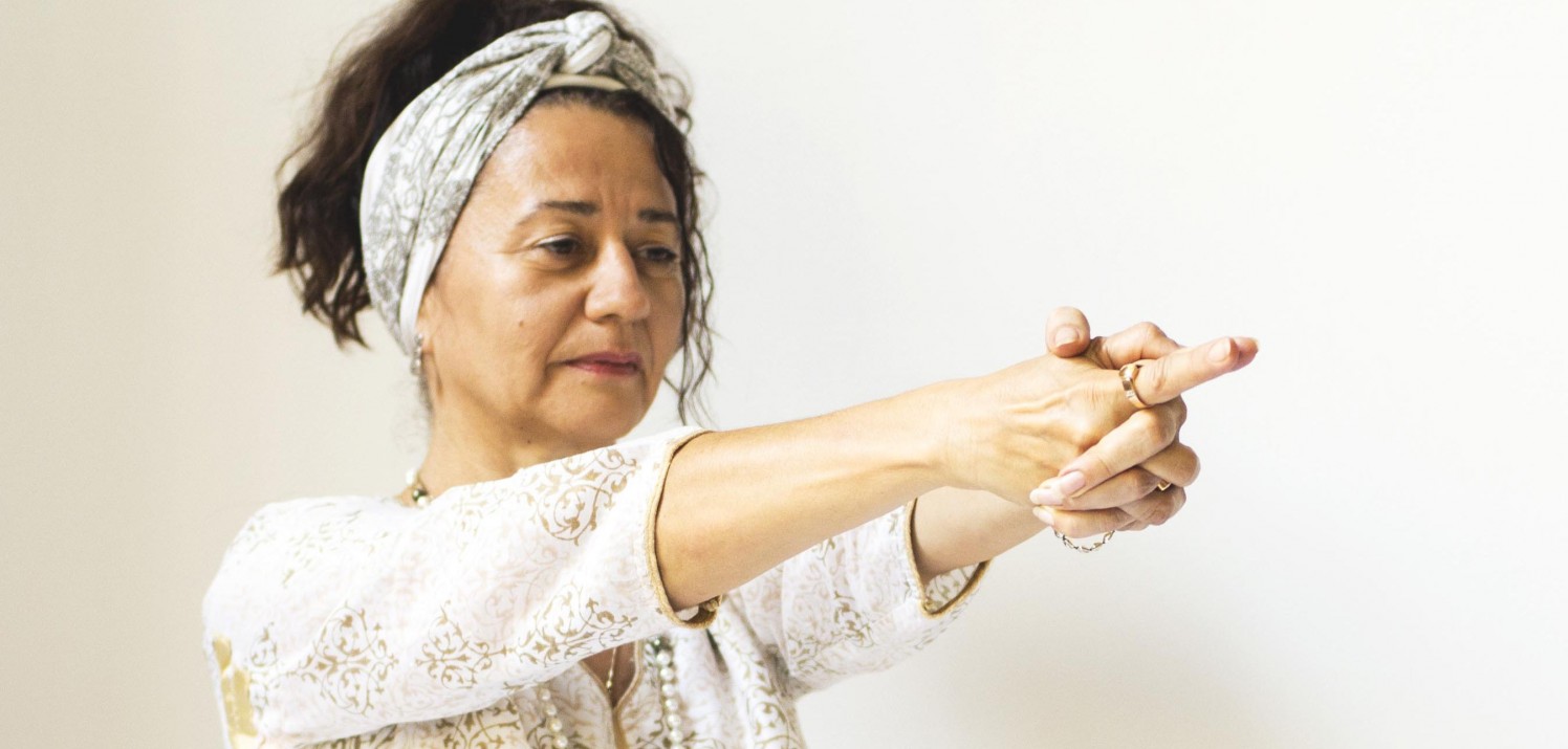Ispravite leđa. Podignite ruke paralelno podu i napravite mudru kao za Sat kriju (prepletite sve prste osim kaziprsta, levi palac je kod žena preko desnog, kod muškaraca obrnuto). Pogled je usmeren pravo napred, gledate preko vrhova ispruženih kažiprsta kao preko nišana pravo napred. Vizualizujte neki cilj koji želite da dostignete pravo ispred vas. Dišite normalno, duboko i lagano.