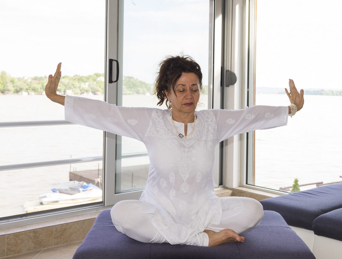 #2 Ostajemo u turskom sedu , sa udahom podignemo ruke u krugu gore, sa izdahom vraćamo ruke u položaj kao iz prve vežbe, ruke paralelne podu, dlanovi 90 stepeni nagore. 1-2 minuta