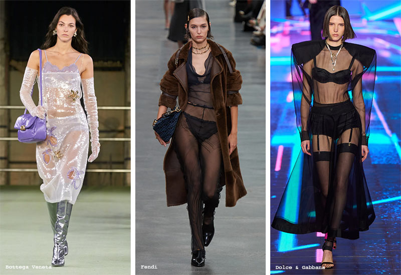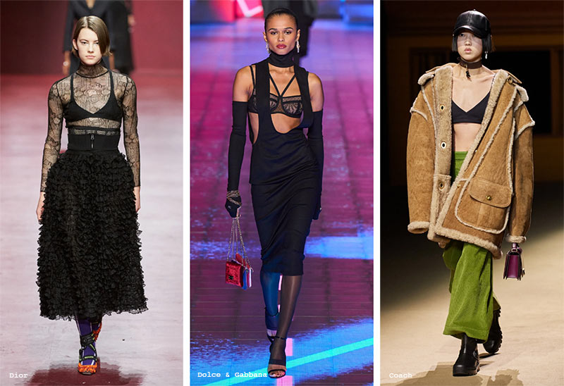 Nastavljajući sa izgledom crnih grudnjaka, prozirne haljine i šorts sa karličnim kostima postali su modni trend svih zvezda za jesen i zimu. Skrećući ka mekom i senzualnom izgledu, Fendi je težio tankim haljinama i korsetima kako bi istakao žensku ženstvenost na radnom mestu. Drugi brendovi koji su takođe uživali u ovom flertovanju sa više seksualnog oblačenja bili su Miu Miu, Simone Rocha i Bottega Veneta.