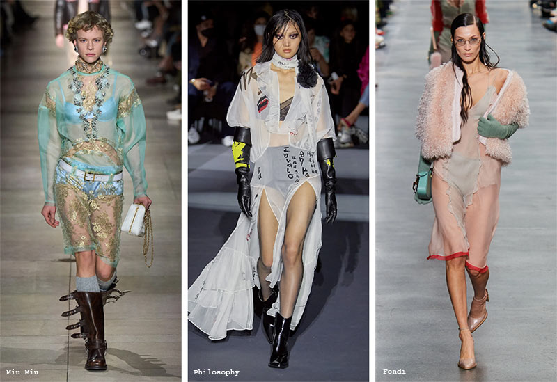Nastavljajući sa izgledom za noćne izlaske, čisti detalji su postali oslonac za dizajnere. Iako bi vas neki od ovih izgleda mogli dovesti u nevolje zbog javne nepristojnosti, to nije bila briga za dizajnere koji su kreirali kolekcije oko ovog sparno izgleda. Ako ste zainteresovani da nosite ovaj izgled, nekoliko pogleda prema Fendiju će vas usmeriti u pravcu pravog donjeg veša za nošenje. Međutim, ako je ovo novi izgled za lutanje po kući, Coperni će ispuniti prazninu svojim komadima inspirisanim negližeom.
