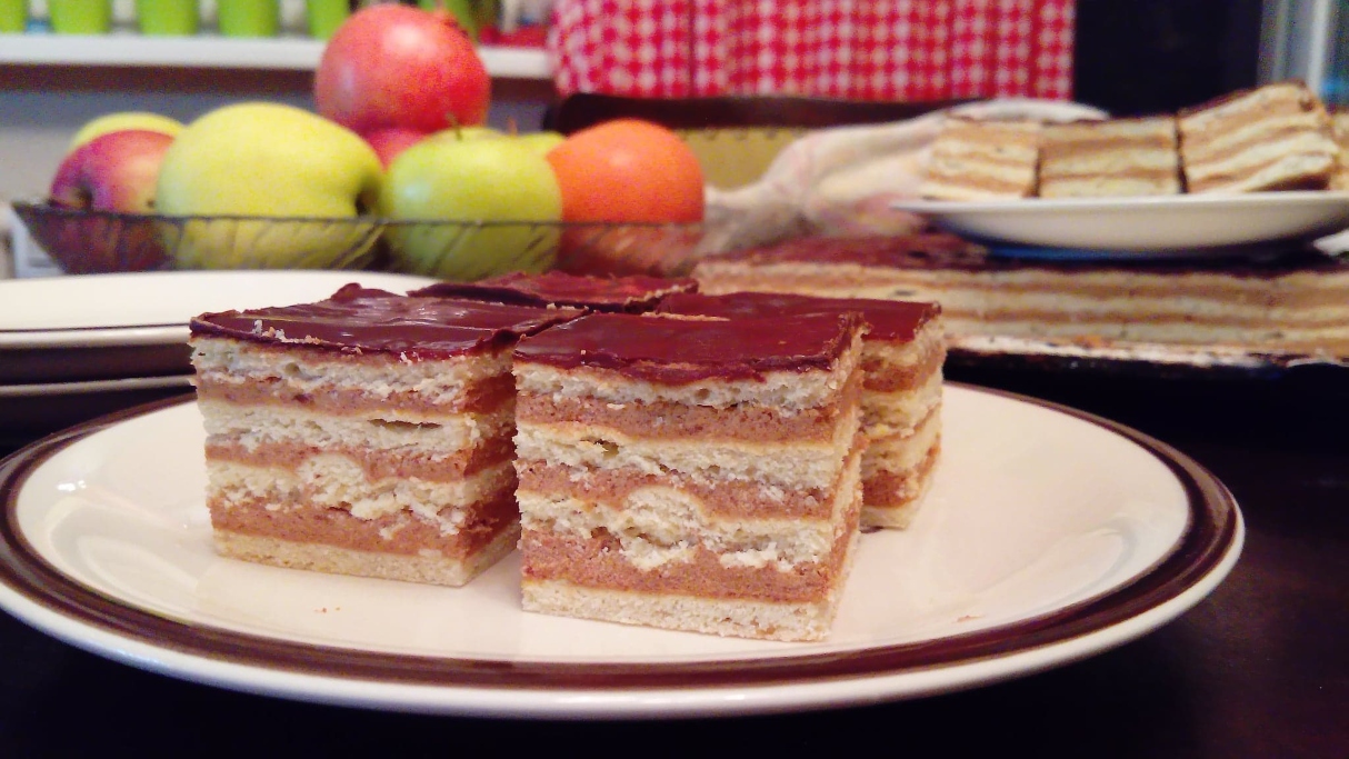 Od navedenih sastojaka, umesite testo, podeliti u četiri jednaka dela i razvite kore debljine dva milimetra, u skladu sa veličinom pleha za pečenje u obliku pravougaonika. Svaku koru pecite 15 minuta, na prevrnutoj tepsiji, na 200°C. Ostaviti kore da se ohlade.
