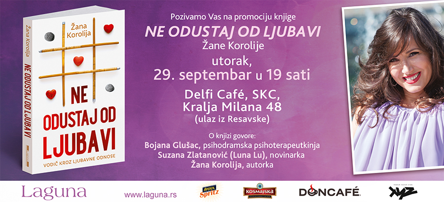 O knjizi „Ne odustaj od ljubavi“, pored autorke, govoriće Bojana Glušac, psihodramska psihoterapeutkinja, novinarka Suzana Zlatanović, poznatija kao Luna Lu i urednik Lagune Slobodan Guberinić.