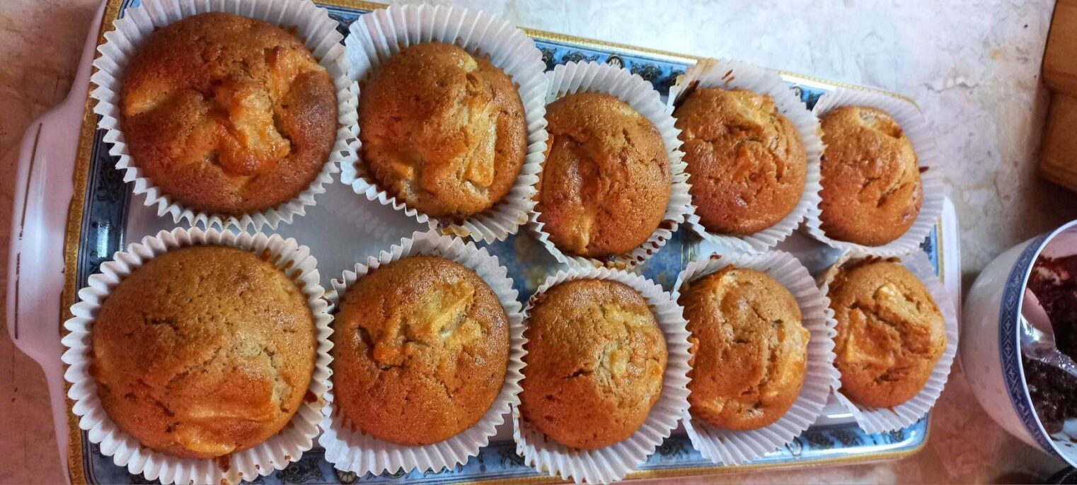 Potrebno je 250 gr brašna, jedan prašak za pecivo, kašičica cimeta, dva jaja, jedna šolja šećera, ¾ šolje ulja, jedna šolja mleka, dve jabuke, šećer u prahu.