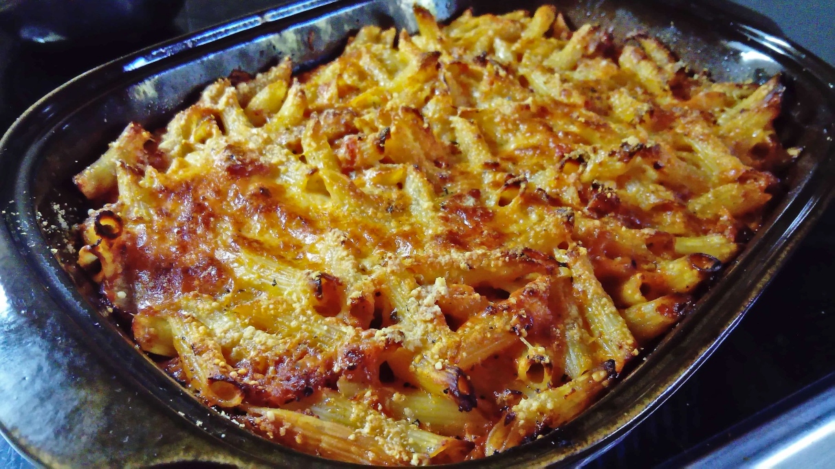 Odgore sam posula rendarim parmezanom, poklopila pekač i stavila u zagrejanu pećnicu da se peče na 200°C tačno 40 minuta. Nakon toga sam otkrila pekač, da se testenina lepo zapeče i porumeni, da bude hrskava korica.