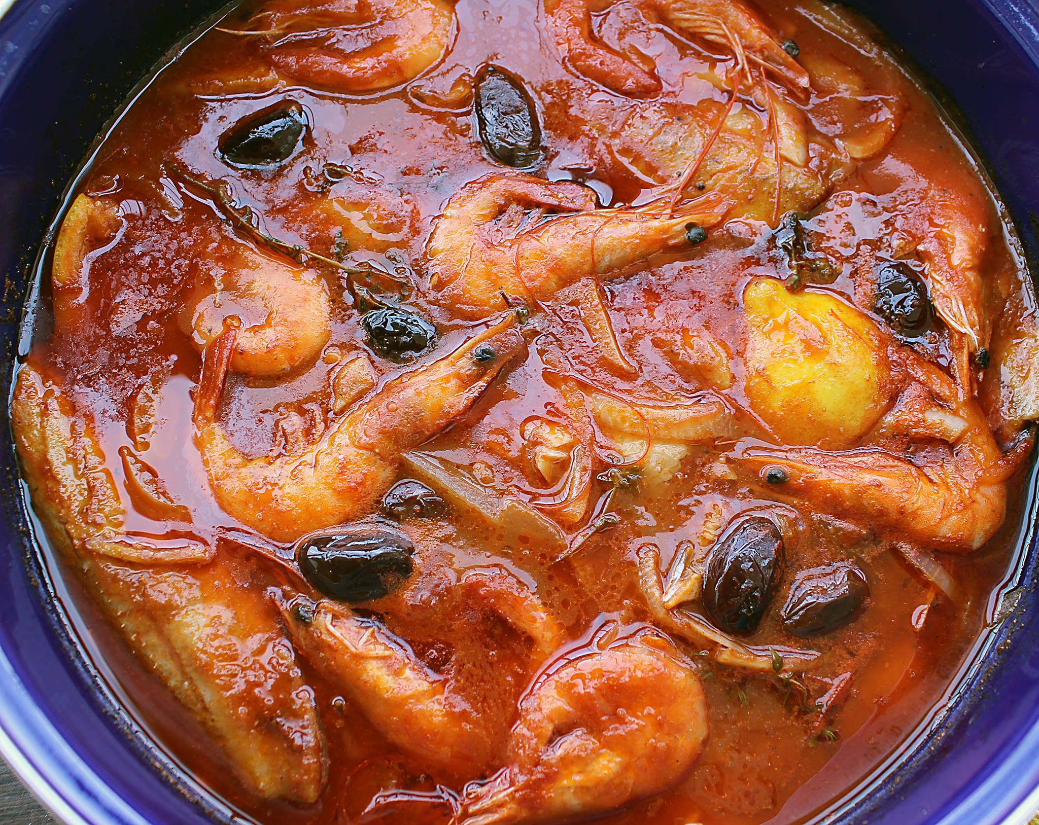 Pored ribe, potrebno je da spremite pasirani paradajz 0,7l, škampe, po ukusu, nije obavezno, mada, odlični su za dekoraciju i konačan izgled jela, dve glavice crvenog luka, par češnjeva belog luka, lovor, ruzmarin, koren đumbira, limunova kora, belo vino ili roze, ako više volite, pola čaše je sasvim dovoljno, so, biber, malo belog ili žutog šećera i nezaobilazne masline.
