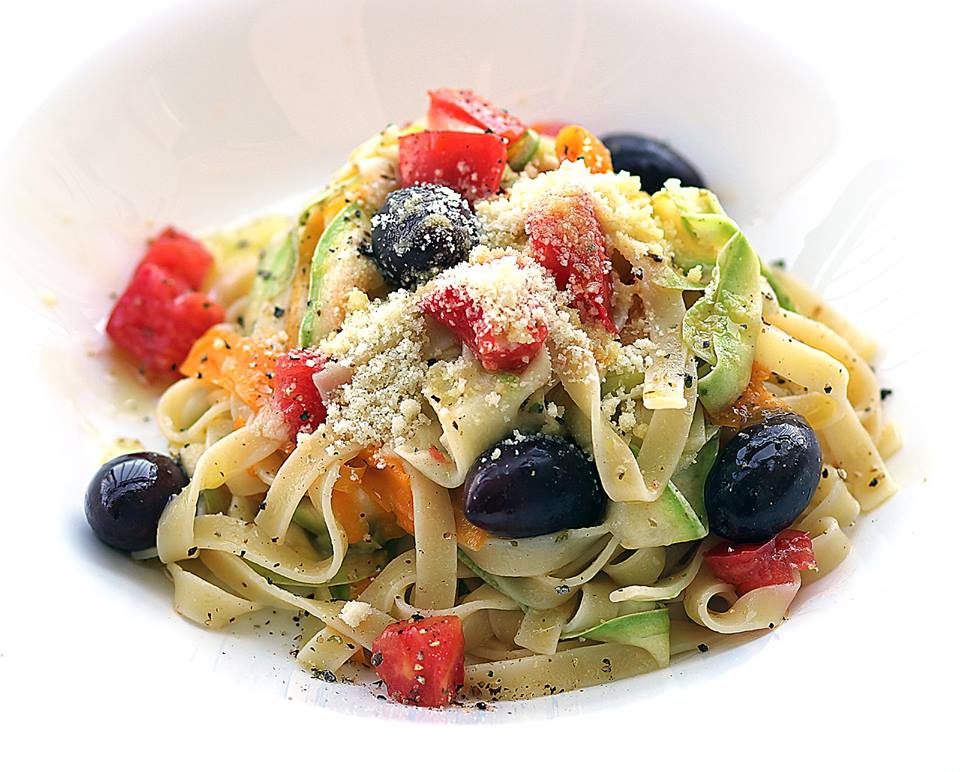 Staviti taljatele da se kuvaju u provreloj vodi i na pola kuvanja dodati tanko sečenu šargarepu. Završiti kuvanje zajedno sa testeninom. Procediti. U vrele testenine dodati tikvice, paradajz isečen na kockice, masline, beli luk, so, biber.