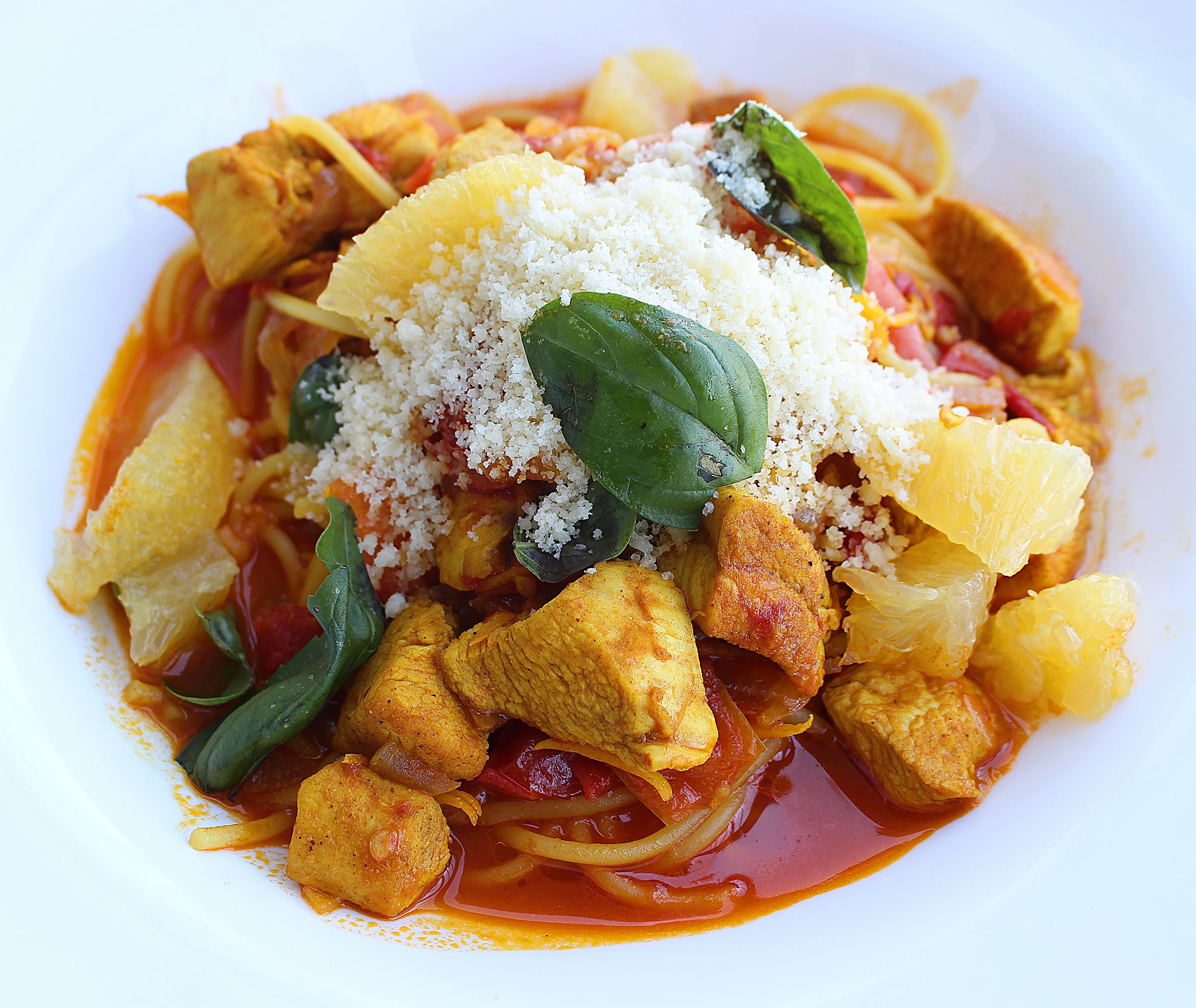 Pospite parmezanom. Od začinskih trava, dodajte u špagete bosiljak, majčinu dušicu, origano, svežu nanu i šta god ko voli. Preko, obavezno stavite kriške sveže pomorandže, očišćene od opne i koštica.