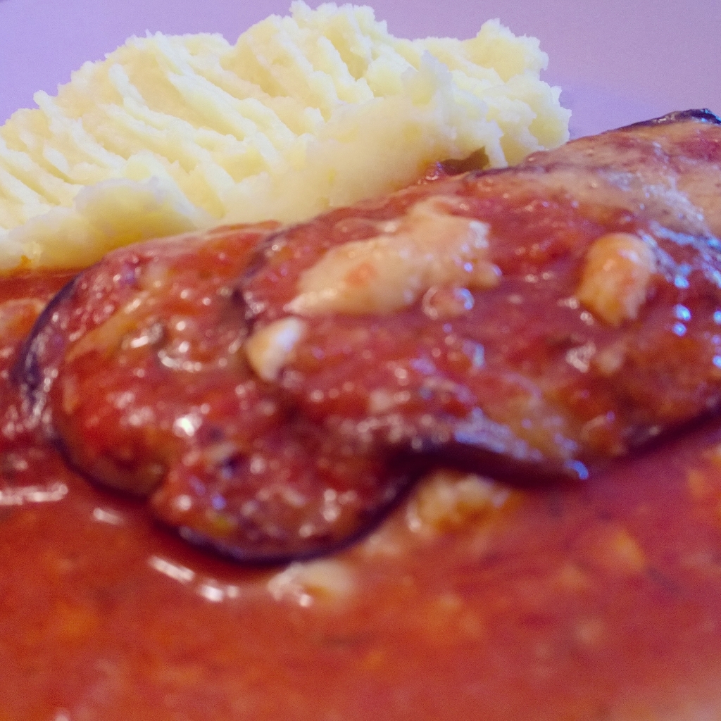 4 teleće šnicle, 1 plavi paatlidžan, 200 gr paradajz sosa sa bosiljkom, 250 gr mocarele, 50 gr rendanog parmezana, 6 sk belog vina, 6 sk maslinovog ulja, so, biber.