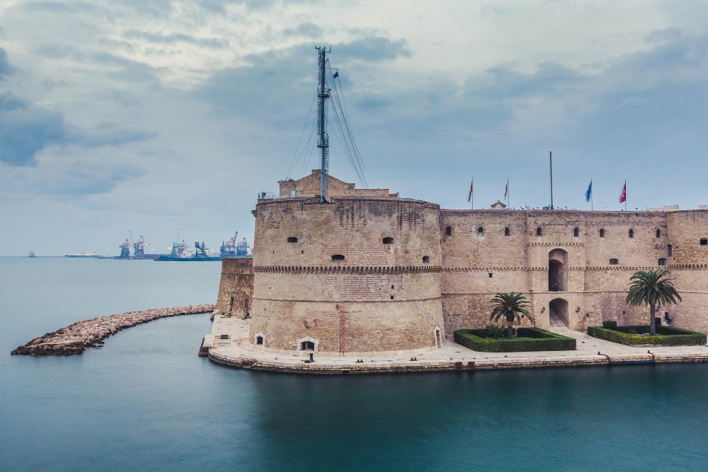 Aragonski zamak, izgrađen krajem 15. veka, i Okretni most, simbol inženjerstva 19. veka, svedoče o pomorskoj vokaciji grada. U uličicama Starog grada, među balkonima ispunjenim cvećem i zanatskim radionicama, otkrivaju se barokne crkve poput katedrale San Kataldo i ostataka dorskog hrama Posejdona, najstarijeg mesta bogosluženja u Velikoj Grčkoj.